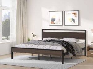 [Stylish & Simple Design]: The combination of rustic style headboard and footboard with coated satin gloss metal slats creates a strong industrial / rustic flair, adding an industrial and unique touch to your room. The headboard consists of a classic color wood board. [Sturdy & Durable]: The solid metal structure has a load-bearing capacity of up to 1000 pounds, and the thickened bed foot makes the bed not shake. [Noise Free]: The EVA pads avoid noise between slats and brace. The plastic plug hold the metal slats in place without moving while the plastic foot pads added to the bottom of the bed feet will never scratch your beloved floor. [Easy To Assemble] Brief and easy understanding IM to help your quick assembling. It only takes about 30 mins for two adults to put it together. [No Box Spring Needed]: Included metal slat system allows total mattress support without an