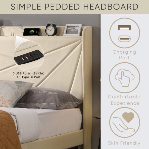 Storage Shelf with Charging Station: Our bed is equipped with a convenient storage shelf that includes built-in 20w fast charging ports (including 3 USB ports and 1 Type-C port). This feature allows you to conveniently charge all your electronic devices at any time, keeping them ready for use. Additionally, the 2 tier headboard storage provides a practical space to keep common small items, such as remotes, within easy reach, ensuring easy access and organization.