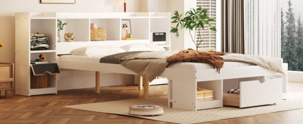 5 reviews for Queen Size Wood Platform Bed with Multi-storage Headboard and a Drawer, White