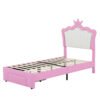 2 reviews for Twin Size Upholstered Bed Frame with LED Lights, Modern Upholstered Princess Bed with Crown Headboard, a Drawer, Pink+White